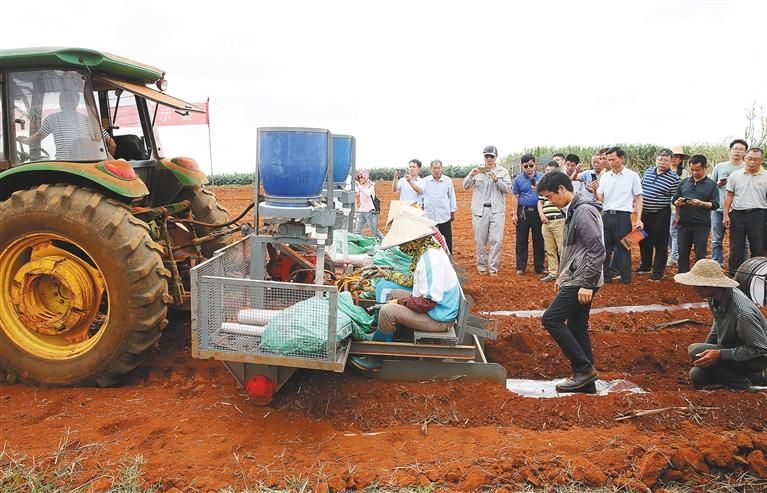 2月28日,一台甘蔗播种机正在演示同时进行播种、施肥、盖膜、铺设滴灌管作业。当日,来自海南、广西等省区部分市县的农机部门负责人和技术骨干、甘蔗种植大户,制糖企业农务负责人近百人,在临高县皇桐镇中国热带农业科学院甘蔗试验基地,参加“甘蔗生产机械化技术现场观摩会”。 据介绍,此次观摩会是为推进海南省甘蔗生产机械化水平,降低生产成本,提高生产效率促进增收。