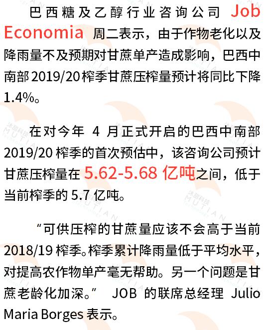 降雨低于预期 巴西中南部19/20榨季甘蔗压榨量或同比下降