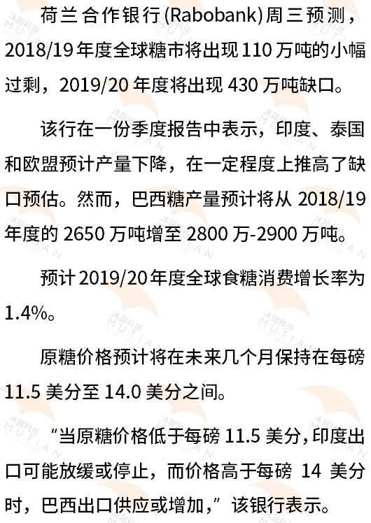 Rabobank:19/20年度全球糖市将现430万吨缺口
