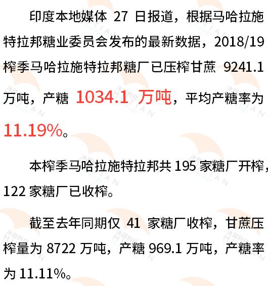 印度:马邦已产糖1034万吨 122家糖厂收榨