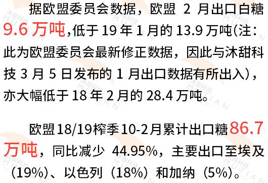 欧盟:18/19榨季截至2月糖出口量同比减少45%