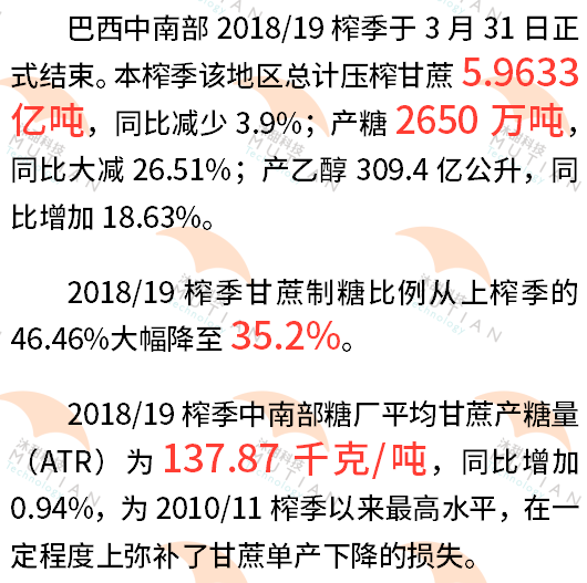 巴西中南部:2018/19榨季最终糖产量为2650万吨 同比大降26.51%