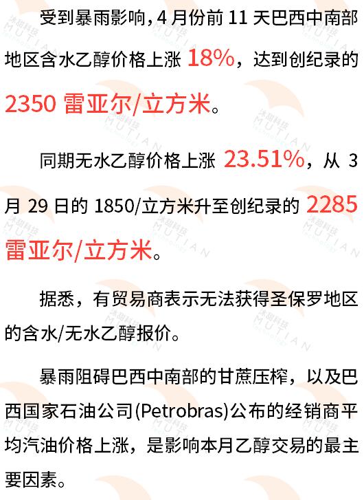 巴西中南部:暴雨影响压榨,4月乙醇价格急涨