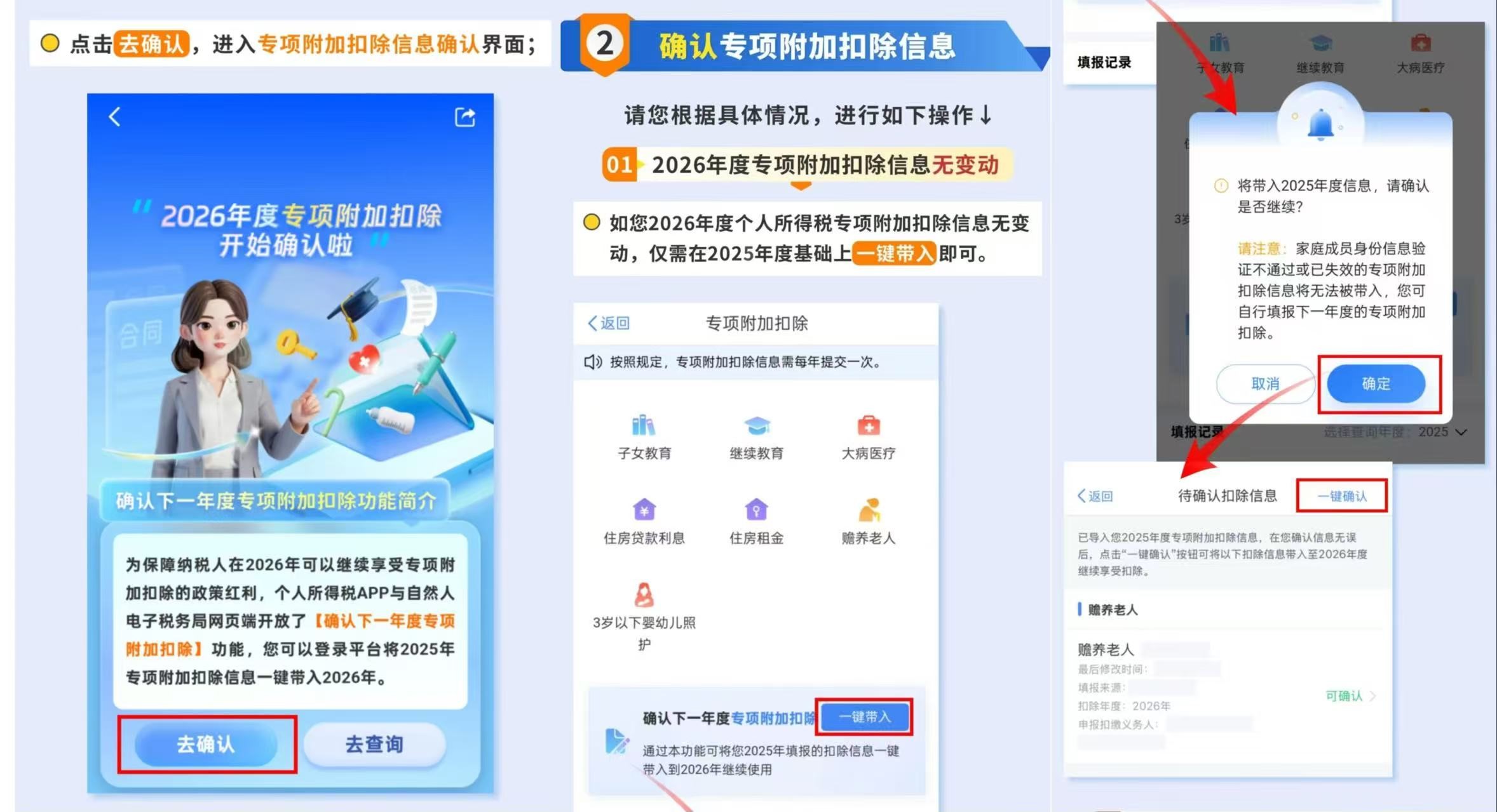 各位老师: 根据《国家税务总局关于修订发布〈个人所得税专项附加扣除操作办法(试行)〉的公告》有关规定:纳税人次年需要由扣缴义务人继续办理专项附加扣除的,应当于每年12月份对次年享受专项附加扣除的内容进行确认,并报送至扣缴义务人。 请及时登录手机“个人所得税”APP,通过查询模块检查个人专项附加扣除填报情况,如与上一年度一致,可以通过首页常用业务栏“专项附加扣除填报”的一键带入功能进行确认;如专项附加扣除发生变化,请及时调整。 云南农业大学财务处