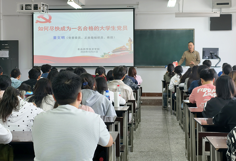 为引导入党积极分子端正入党动机、深化对党的认识、筑牢思想根基,实现从思想上真正入党,食品科学技术学院党委于2025年10月31日在逸夫楼B区406开展了2025年入党积极分子集中培训。本次培训由院党委委员、正处级组织员董文明主讲,2025年4月、10月确定的135名入党积极分子参加了此次培训。