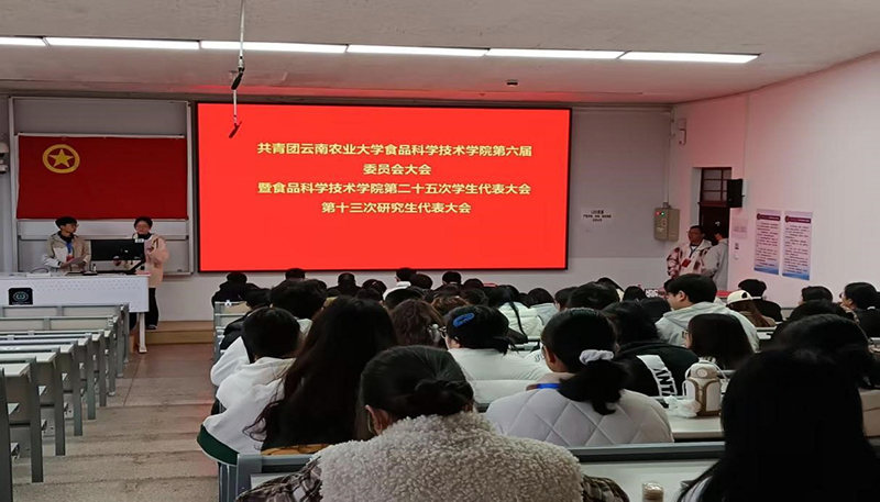 2025年12月27日,食品科学技术学院在厚德楼1-5隆重召开第六届团代会、第二十五次学生代表大会和第十三次研究生代表大会。学院党委副书记黄启超,团委副书记马云双等老师及学生代表共80余人出席大会。