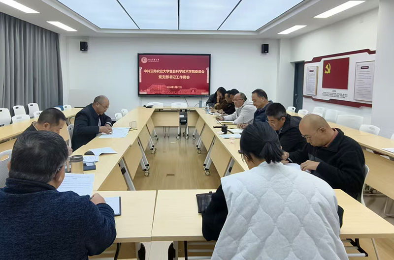 2026年2月27日,学院党委在二楼会议室召开2月份党支部书记工作例会。会议由学院党委书记李世俊主持,正处级组织员董文明、党委副书记黄启超及各党支部书记参加会议。