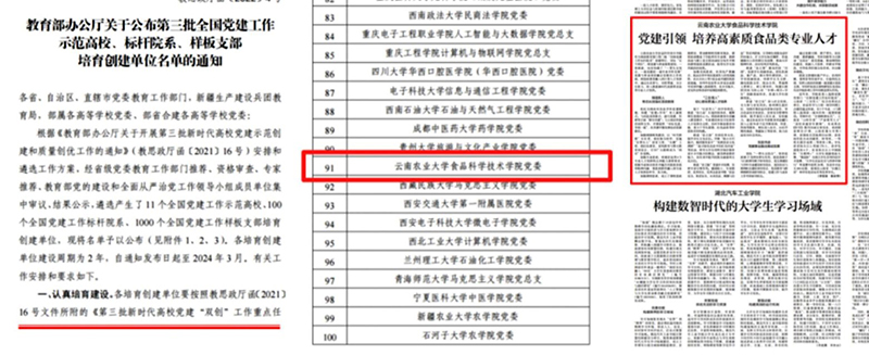 坚持政治建设为统领,创新实施“一带头五结合,一流党建促一流专业学科发展”工作举措,获批教育部“全国党建工作标杆院系”创建并通过验收,一体推进云南省“三全育人”综合改革试点取得实效。坚持将党建与业务统筹谋划、一体推进,构建了“一带头五结合,一流党建促一流专业学科发展”党建与业务深度融合发展的工作机制;紧紧围绕食品学科专业一体化发展,将思政教育强化于本硕博贯通中,融入食品类人才培养各环节全过程,建立了专业思政、课程思政、实践思政“三位一体”的思政教育格局;基于“以食育人”学科专业特色,在全员、全程、全方位育人中推进“食之品”打造价值体系、“食之韵”传承优秀文化、“食之魅”营造学术氛围、“食之智”推进科技双创、“食之安”深入社会实践,形成了以“党建引领、思政铸魂、以食育人”为主要内容的“三全育人”模式。