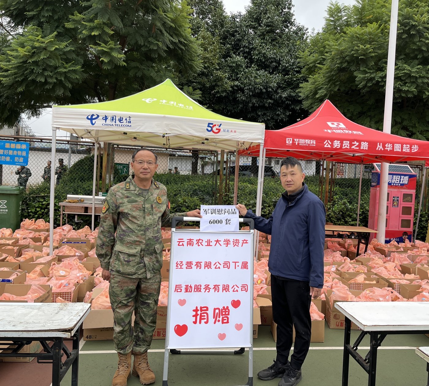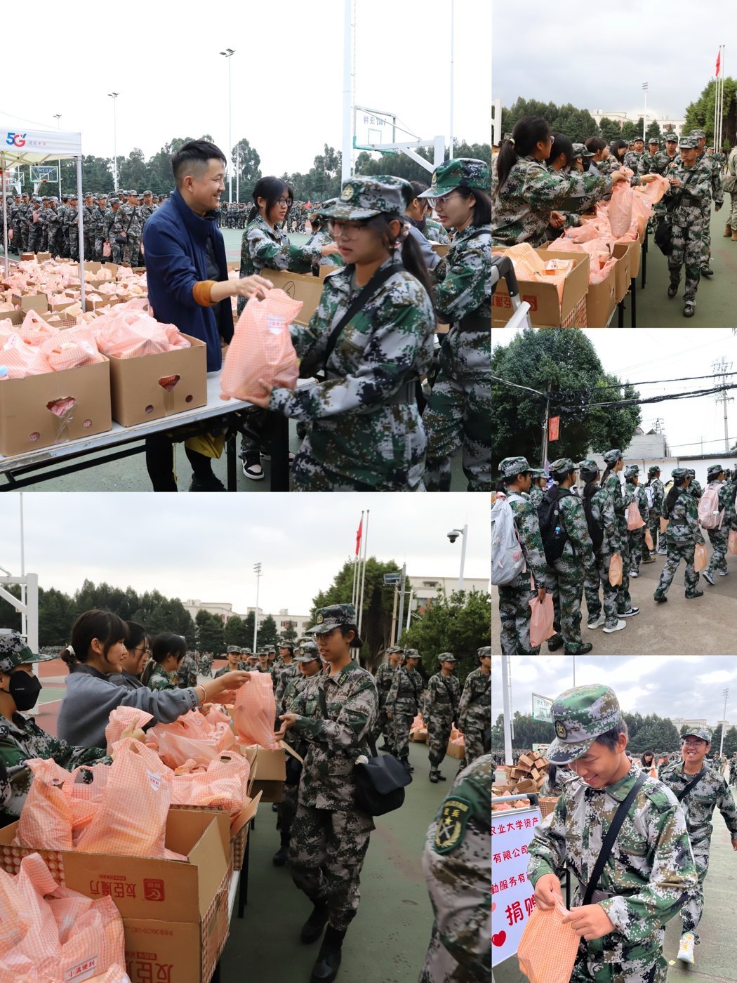 2024年10月20日上午,云南农业大学资产经营有限公司下属后勤服务有限公司在学生处的大力配合下组织开展了爱心捐赠活动,向军训学生、教官、辅导员们捐赠了水果、面包等6000余份慰问品。