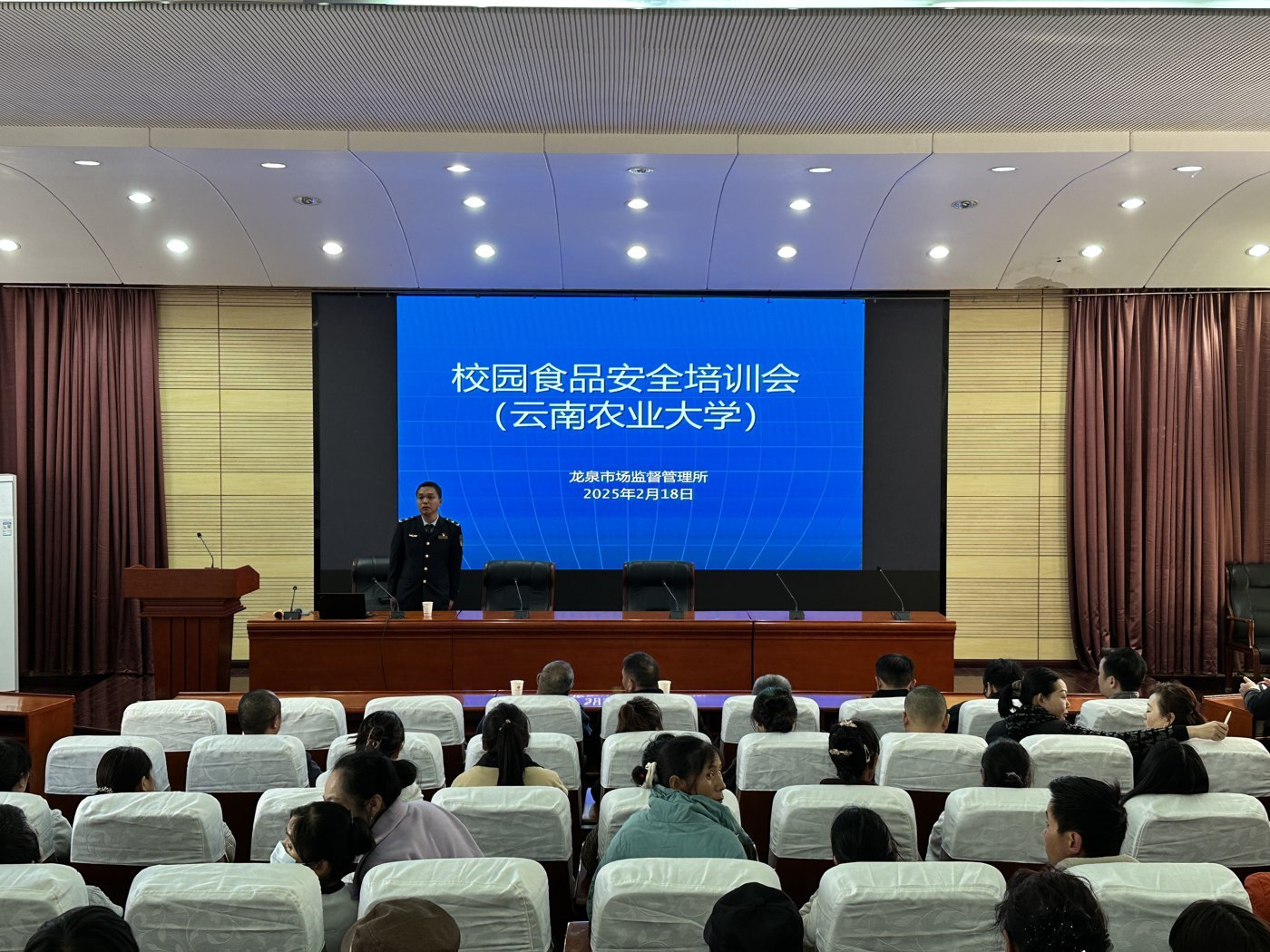 培训会上,昆明市市场监督管理局龙泉所副所长李瑞围绕从业人员管理、食品安全法律法规及管理制度、加工制作规程、食品安全强调事项等四个方面进行了详尽的阐述,并结合实际案例对校园食品安全知识及食品安全风险防控措施进行了讲解。