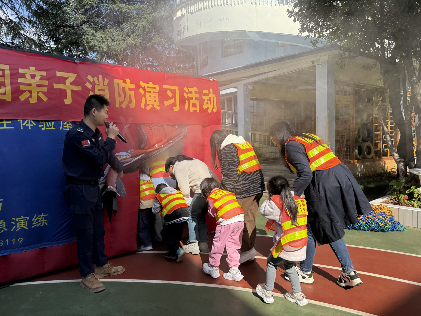 核心体验环节中,“亲子帐篷逃生”成为全场焦点。工作人员用帐篷搭建起模拟烟雾逃生通道,通道内设置障碍与安全标识,同时释放安全烟雾,还原火灾现场环境。家长与孩子手牵手,共同进入“火场”,在实践中学习如何在真实火场中克服恐慌、正确判断和高效逃生。这一沉浸式体验让抽象的逃生知识变得可感、可操作,无论是孩子还是家长都表示收获颇丰。