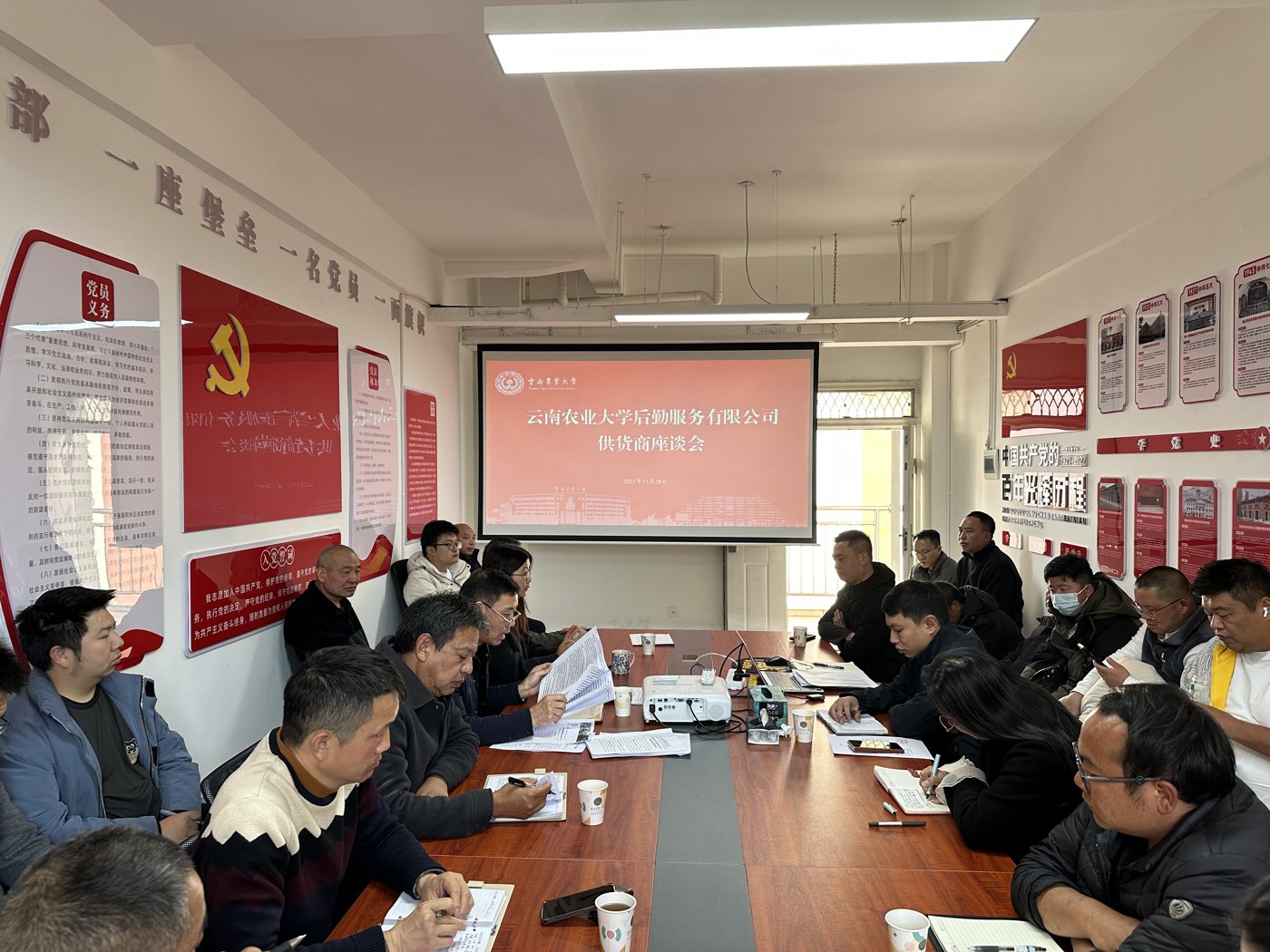 为深入贯彻落实食品安全相关要求,进一步规范食堂物资采购工作,提升餐饮服务保障水平,11月28日,云南农业大学后勤服务有限公司在公司会议室组织召开食堂供货商座谈会。公司董事长、总经理、副总经理、餐饮管理中心相关负责人及30家食堂供货商负责人共同参会,会议由总经理、校园食品安全总监汪占山主持。
