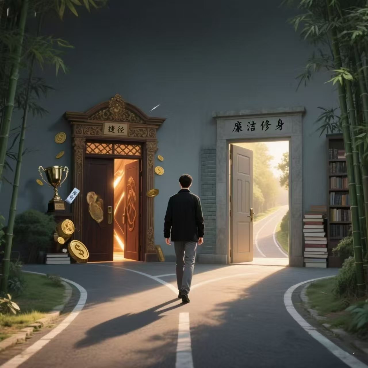 陈劼芃老师的《选择之门》获AI作品类二等奖。华丽的门象征着学术不端、利益诱惑、走关系等“捷径”;朴素的门象征着坚守诚信、脚踏实地、廉洁自律的正道。作品聚焦于个体在大学生涯中面临的道德考验,旨在警示广大师生在学术研究、评奖评优、人际交往等关键时刻,要明辨是非,坚守廉洁底线。