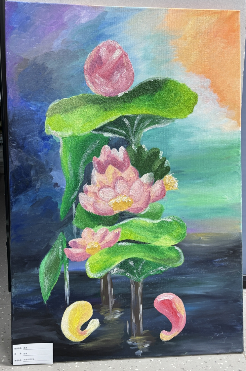 张丽老师的油画《清廉》获书画类三等奖,以莲花为核心视觉元素,取“莲”与“廉”的意象关联。粉艳的莲花从墨色水泽中挺拔而出,翠绿莲叶层叠舒展,花瓣飘落的细节既添灵动,又暗喻清廉本心的纯粹与坚守。整体构图将莲花塑造成向上生长的形态,寓意清廉之风的生生不息与向上引领的精神力量。