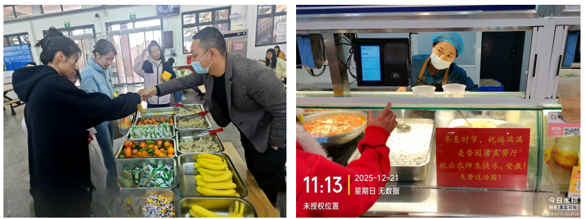 为弘扬中华优秀传统文化,营造温馨和睦的校园节日氛围,12月22日,后勤服务有限公司精心筹划,在各食堂同步开展了“温情冬至 暖意相伴”的主题活动,为师生提供节日特色食品——汤圆、饺子,并送上诚挚的节日问候。