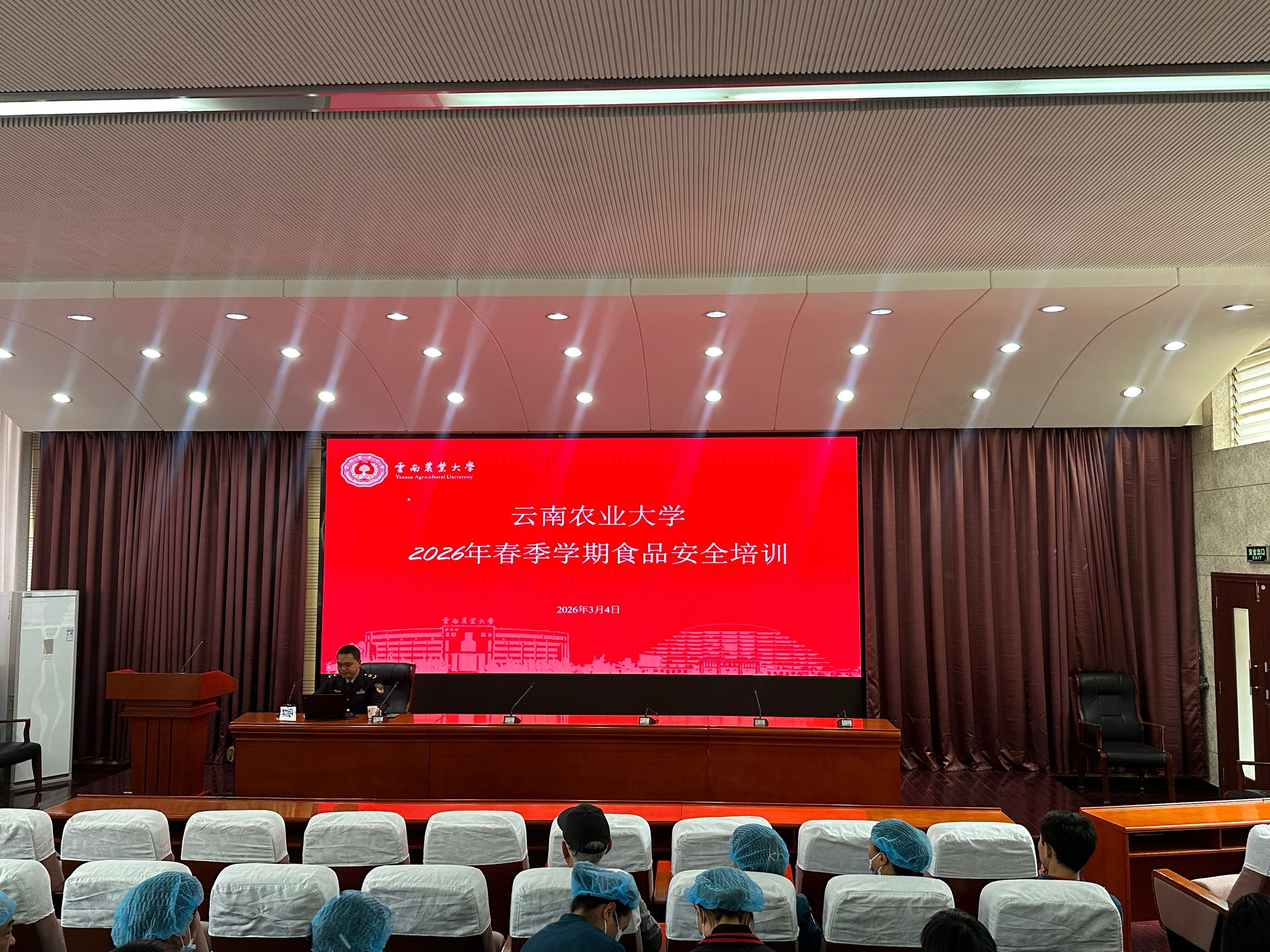 3月4日,学校在继续教育学院报告厅举办2026年春季学期校园食品安全业务培训,特邀昆明市盘龙区市场监督管理局龙泉市场监督管理所副所长李瑞到校授课。校工会、后勤保障服务中心、资产经营有限公司食堂“管办评”三方200余名从业人员参加培训。
